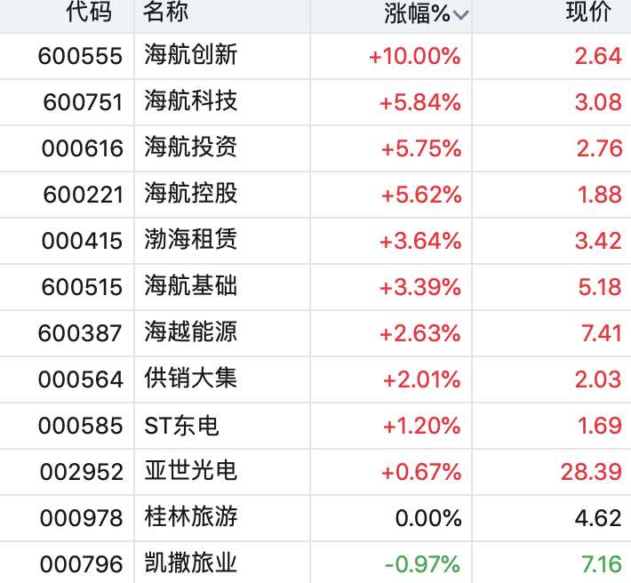 3月2日开盘,港股海航系股票大涨,海航系A股上市公司大多高开。截至发稿,海航创新(600555,股吧)一字涨停,航海科技、海航投资(000616,股吧)、海航控股(600221,股吧)涨超5%,渤海租赁(000415,股吧)、海航基础(600515,股吧)涨超3%。