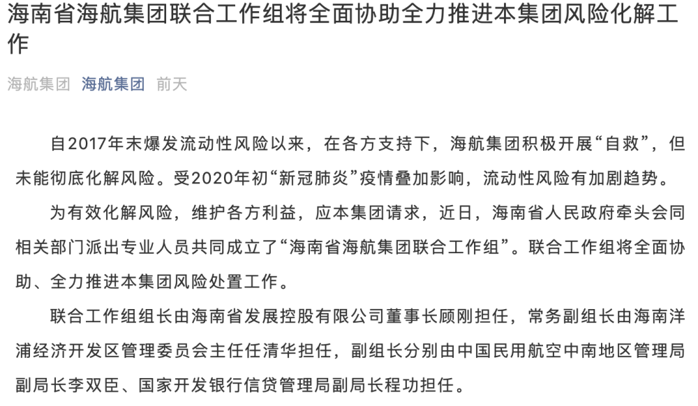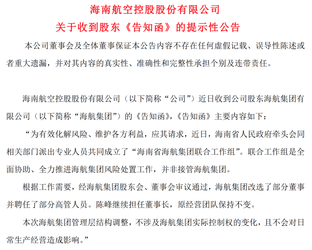 告知函称,近日,海南省政府牵头会同相关部门派出专业人员共同成立了“海南省海航集团联合工作组”。联合工作组是全面协助、全力推进海航集团风险处置工作,并非接管海航集团。